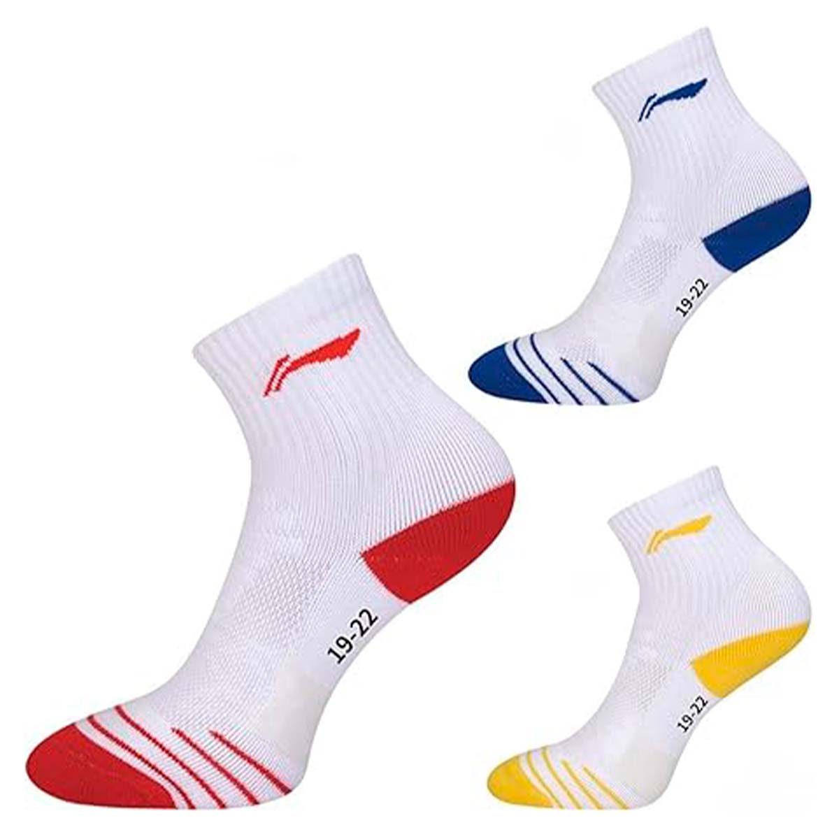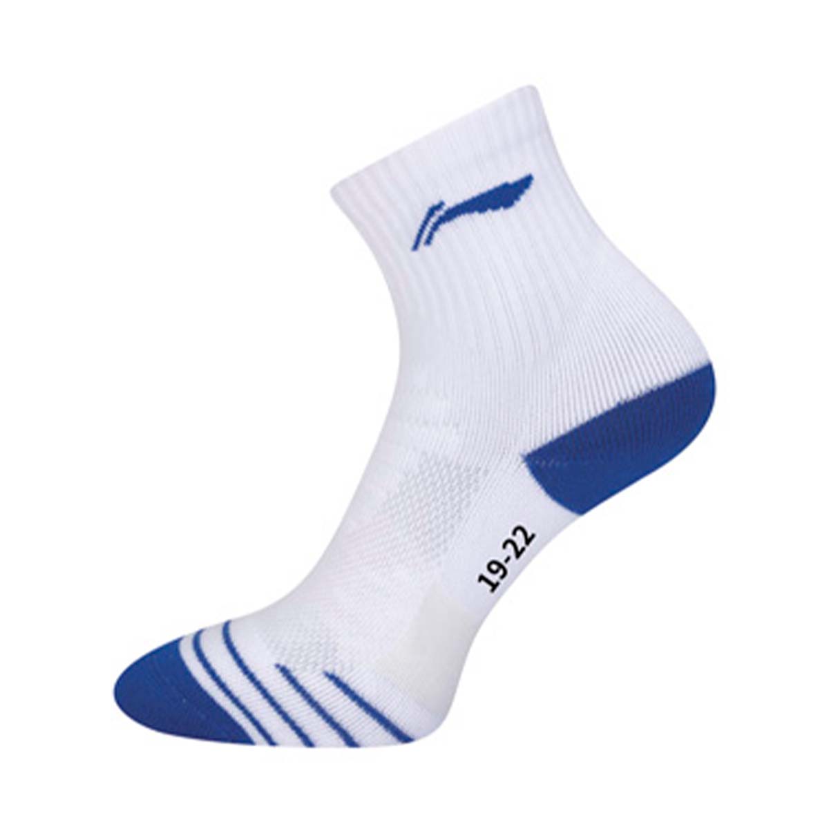 Детские носки для бадминтона Li-Ning белого цвета с синими вставками изготовлены из материалов, которые обладают влагоотводящими свойствами, сохраняя ноги сухими, а также обеспечивают комфорт и поддержку для повышения производительности во время тренировок и игр.