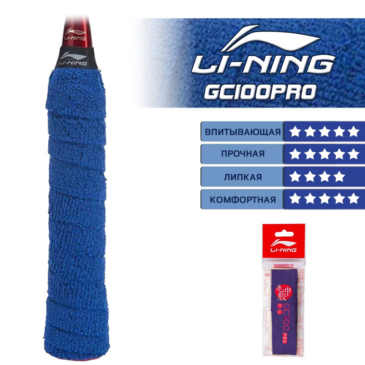 Представляем вам профессиональную махровую обмотку LI-NING GC100PRO синего цвета— идеальный выбор для игроков, которым нужна максимальная защита от влаги и исключительная износостойкость.
