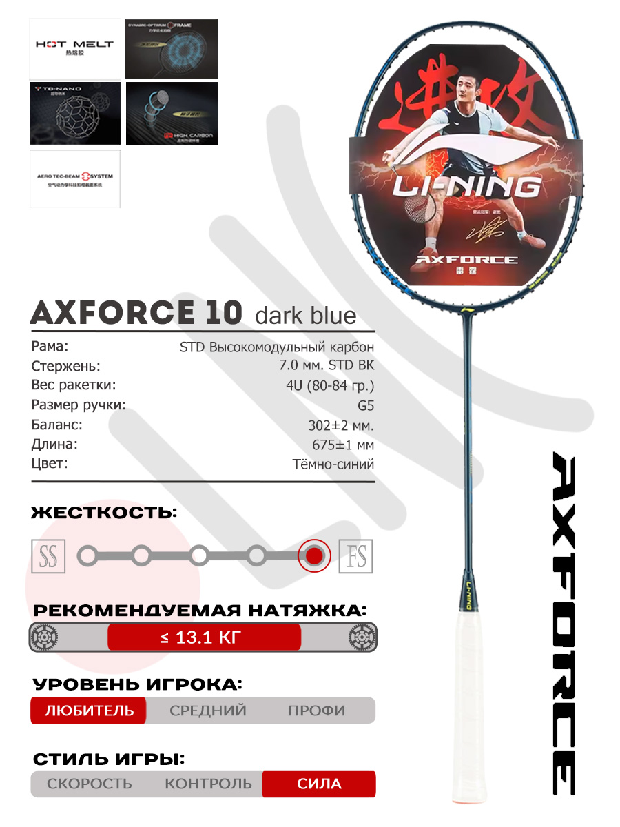 Li-Ning применил для Axforce 10 две главные фирменные технологии, которые помогают игрокам быть более эффективными в игре. Во-первых, это DYNAMIC OPTIMUM FRAME, благодаря этой технологии зона наилучшего восприятия на поверхности ракетки смещена наверх к краю обода. Это удобно для игры на задней линии, или когда вы чуть-чуть не доходите под удар и схватываете волан не в центр ракетки, а чуть выше. Во-вторых, у ракетки низкий уровень вибрационной отдачи (технология AEROTECH BEAM SYSTEM).