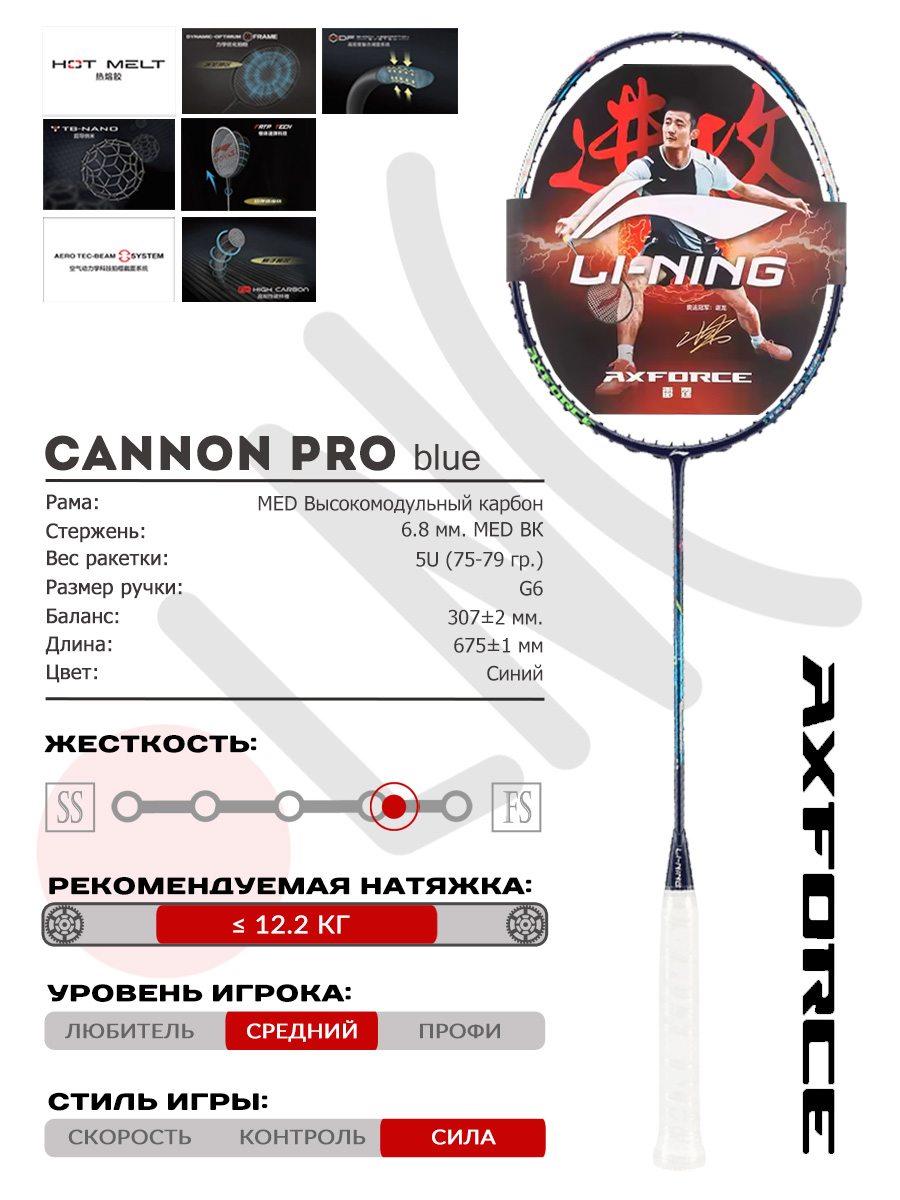 Бадминтонная ракетка Li-Ning Axforce Cannon Pro — про-серия ракеток Cannon 2023 года. Качественная атакующая ракетка в ультралегком весе 5U с улучшенными поведенческими свойствами. Ракетка Axforce Cannon Pro создана для игроков, которые хотят объединить мощность с точностью.