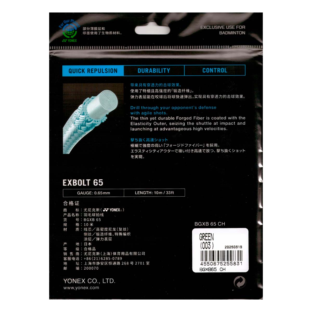 Струна Yonex Exbolt 65 изготовлена из совершенно нового материала под названием Forged Fiber. Материал, который позволил изготовить струну более тонкой толщины без ущерба для долговечности.