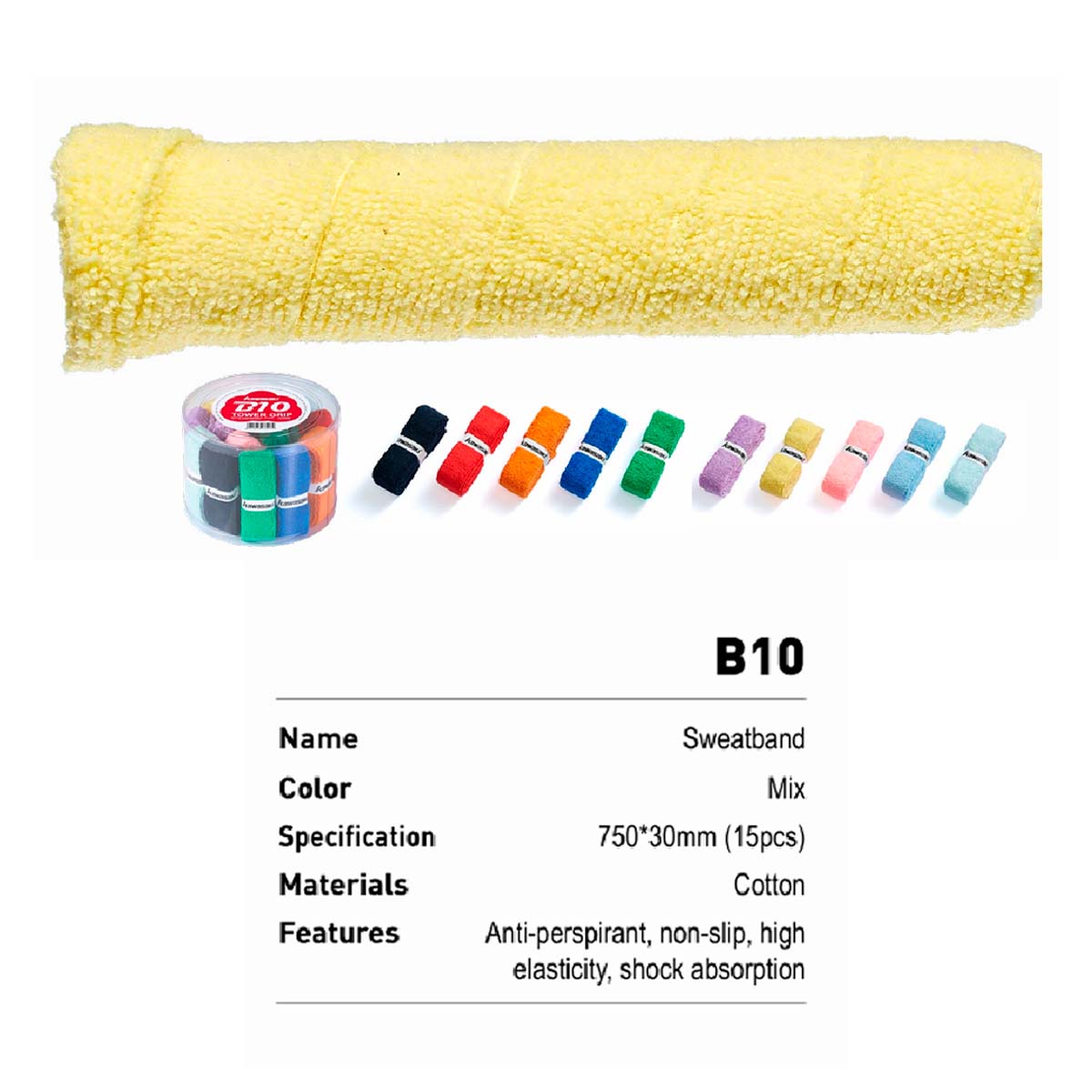 Имеет длину 750 мм и ширину 30 мм, 100% хлопок обеспечивает мягкость и приятные тактильные ощущения, махровая ткань эффективно впитывает пот, предотвращая скольжение ракетки в руке, подходит для ракеток для бадминтона, тенниса и сквоша.