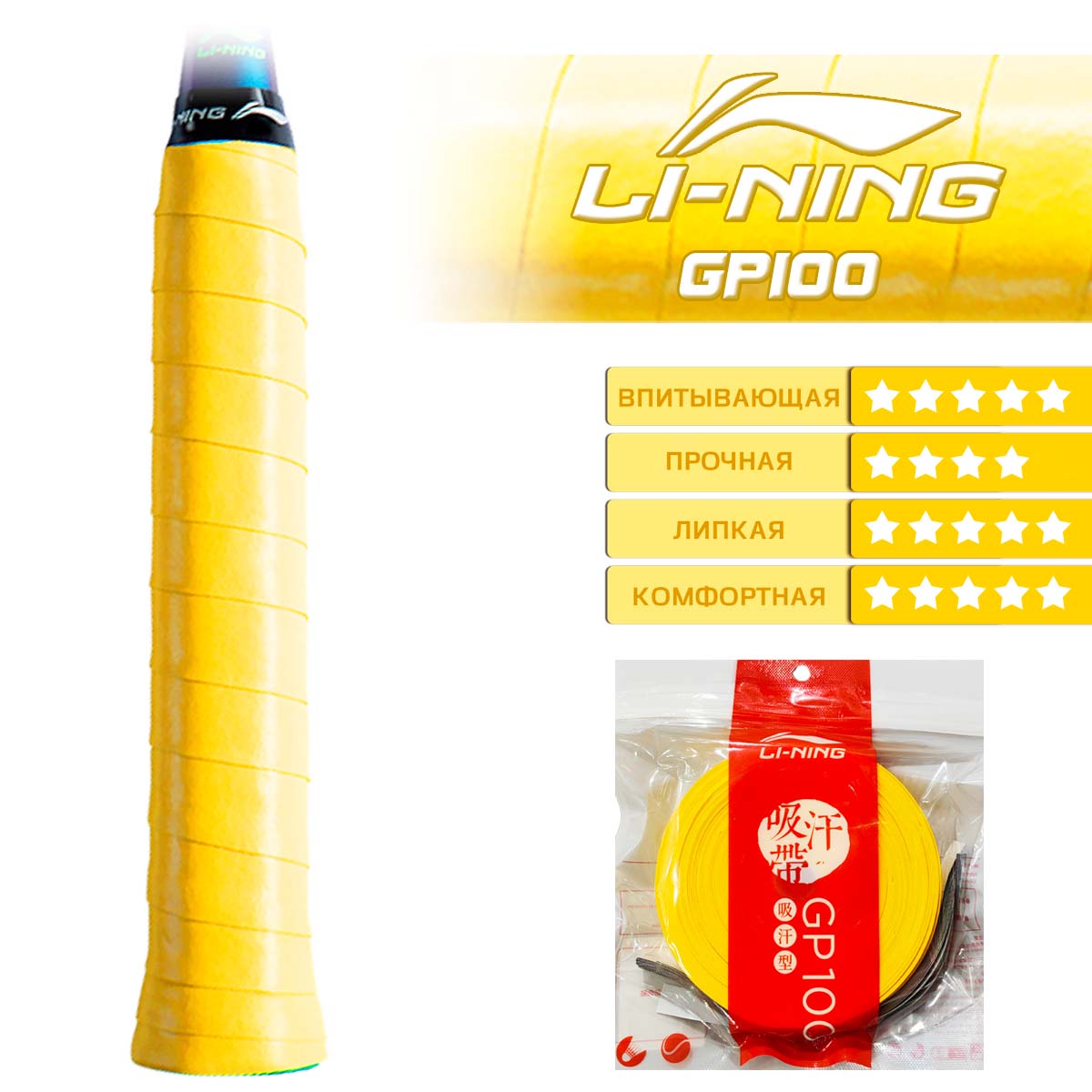 Набор Li-Ning GP100 YELLOW состоит из 15 обмоток желтого цвета. Это не только высококачественный аксессуар, но и функциональный элемент для любителей спорта и профессиональных игроков.