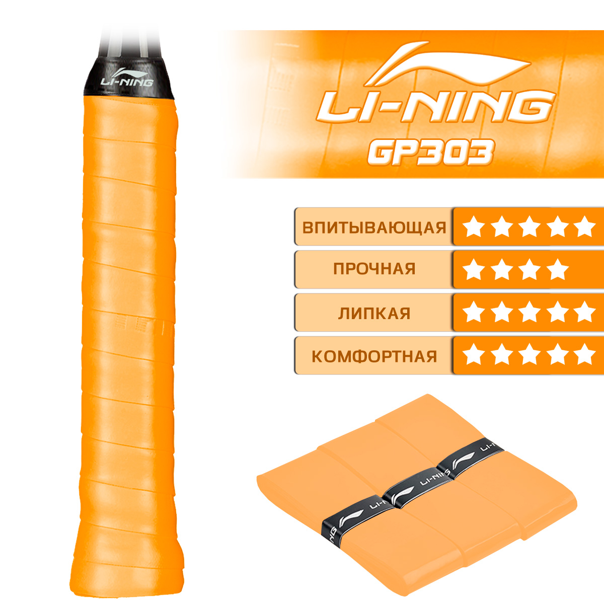 Набор Li-Ning GP303 состоит из 3 обмоток ярко-оранжевого цвета. Это не только высококачественный аксессуар, но и функциональный элемент для любителей спорта и профессиональных игроков.