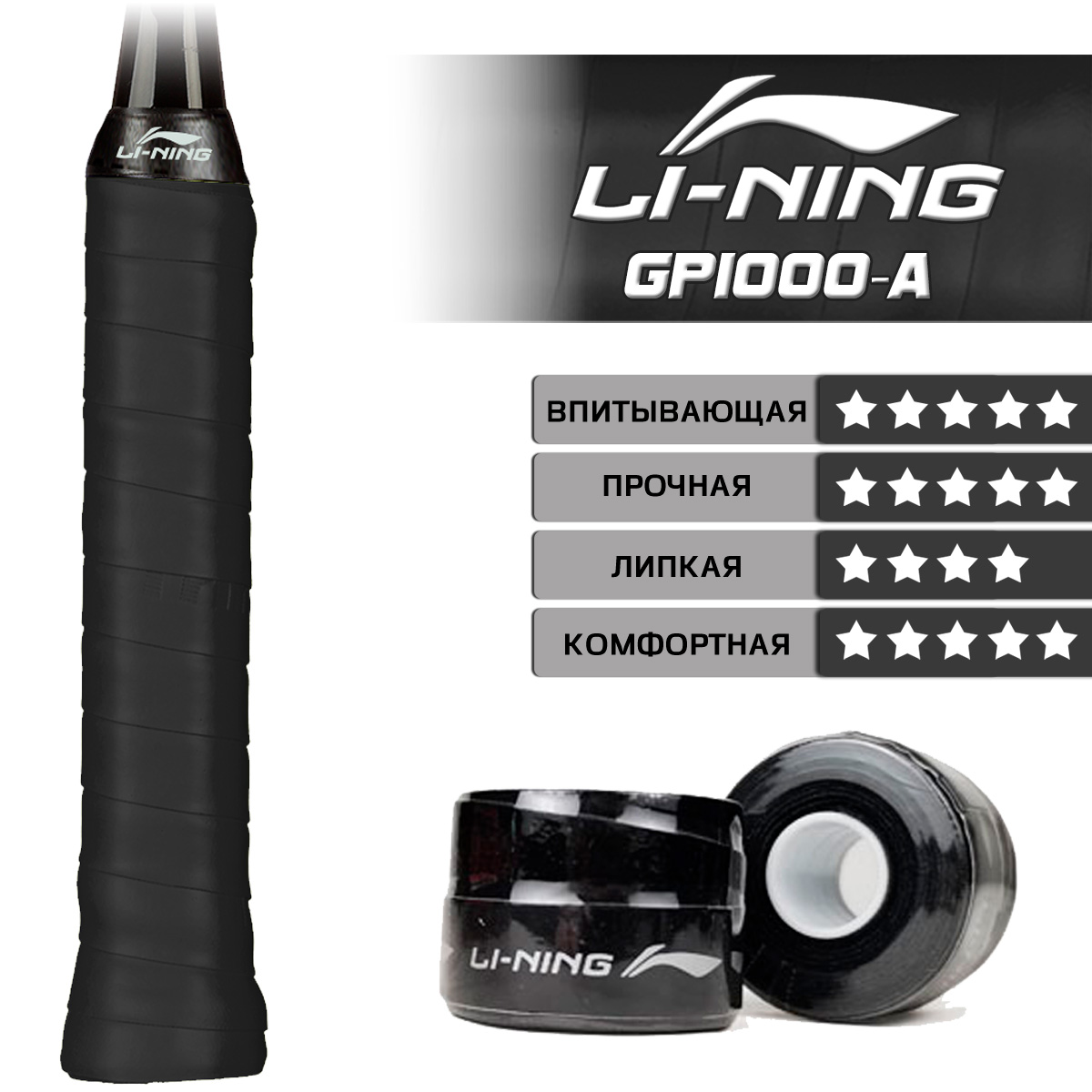 LI-NING GP1000-A - качественная обмотка черного цвета, обеспечивающая хороший захват и комфорт во время игры.