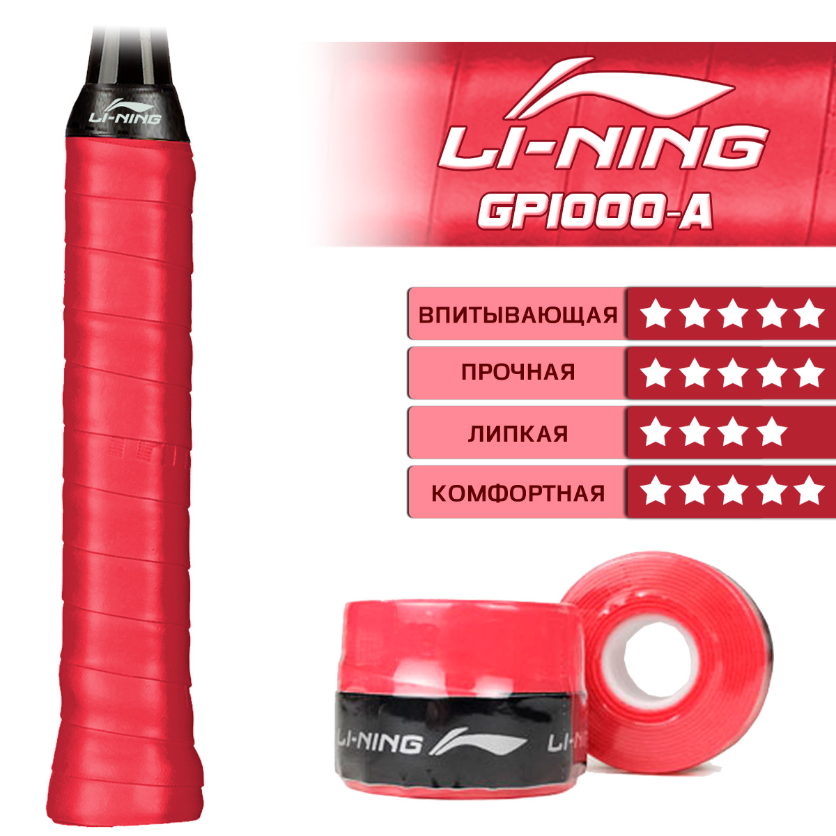 LI-NING GP1000-A - качественная обмотка красного цвета, обеспечивающая хороший захват и комфорт во время игры.