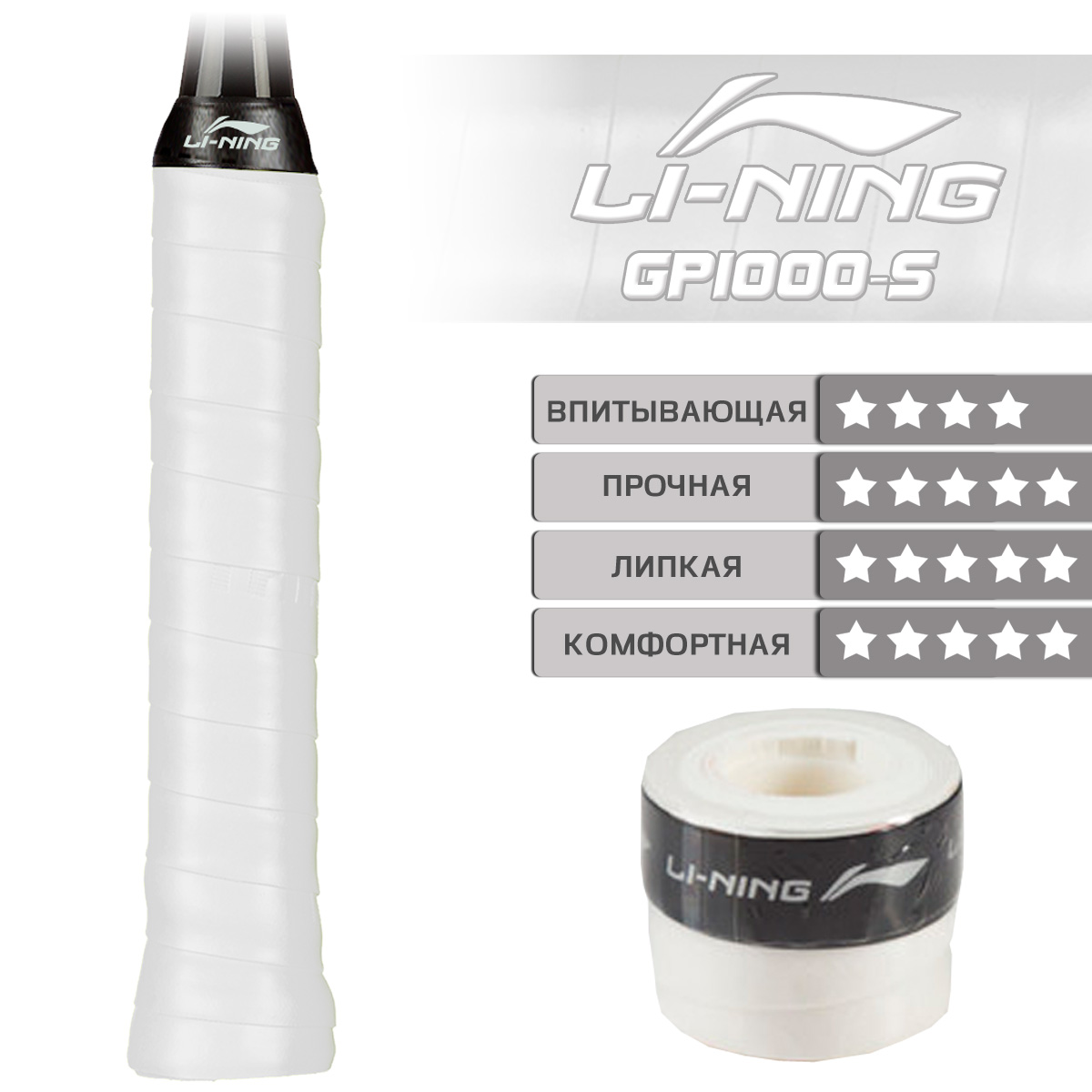Обмотка LI-NING GP1000-S WHITE белого цвета имеет толщину 0,6 мм, что способствует повышению точности во время игры.