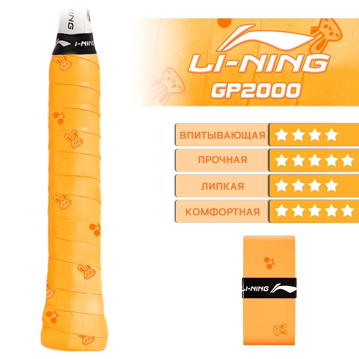 Обмотка Li-Ning GP2000 – это идеальный выбор для игроков в бадминтон и теннис, стремящихся к комфорту, надежности и стилю на корте. Ее уникальный оранжевый цвет, украшенный забавными вишенками и милыми мордочками, не только выделит вас среди других игроков, но и поднимет настроение во время игры.