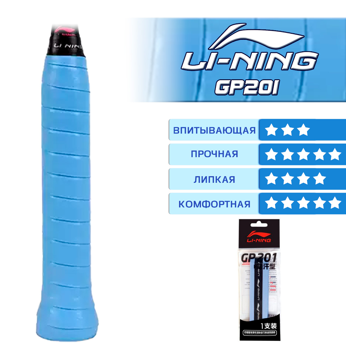 Такая обмотка LI-NING GP201 светло-голубого цвета повышает комфорт и улучшает контроль над воланом или мячом, обеспечивает более точное позиционирование руки на ручке ракетки.