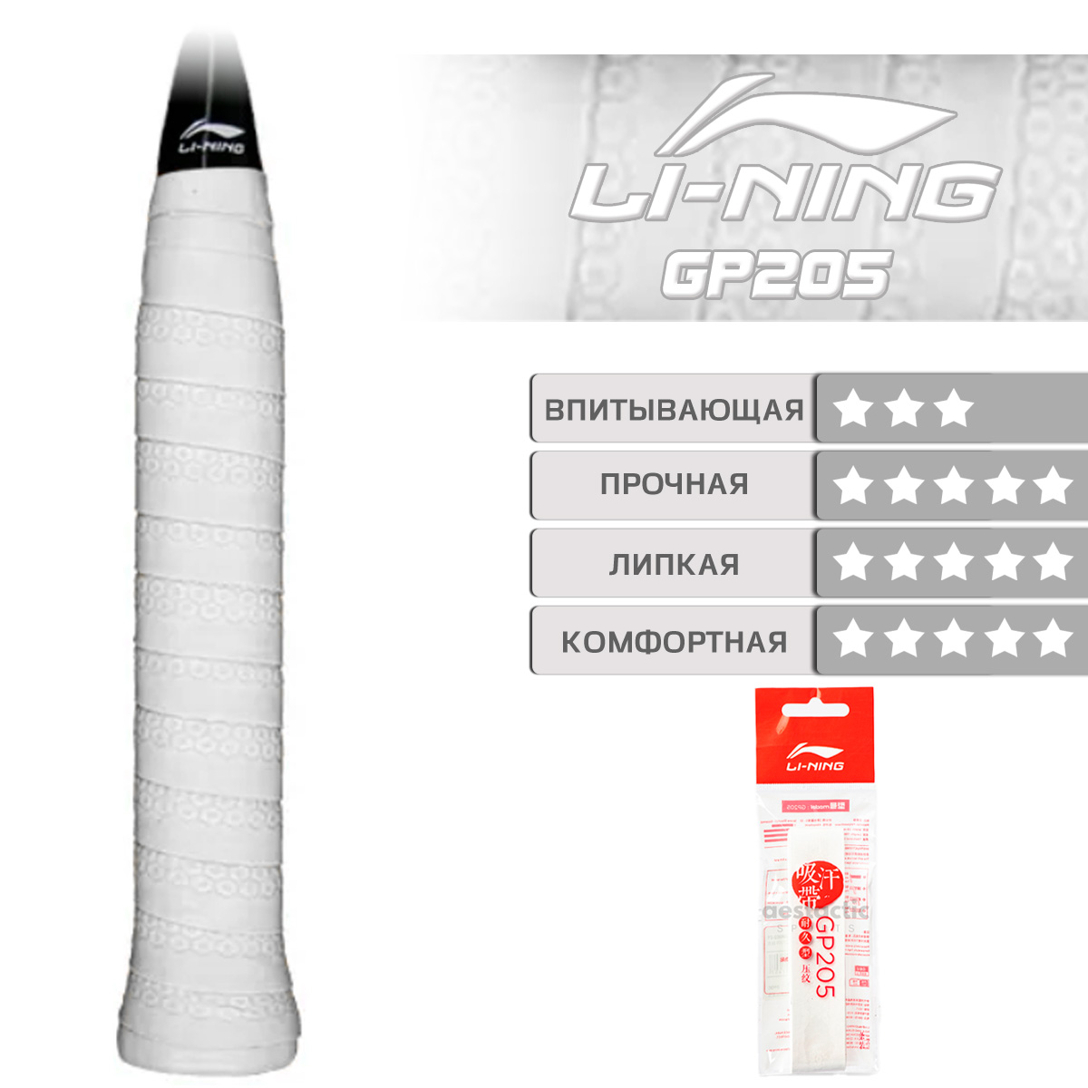 Обмотка LI-NING GP205 белого цвета обладает отличной амортизацией, что помогает снизить нагрузку на суставы при ударах и предотвращает возникновение теннисного локтя.