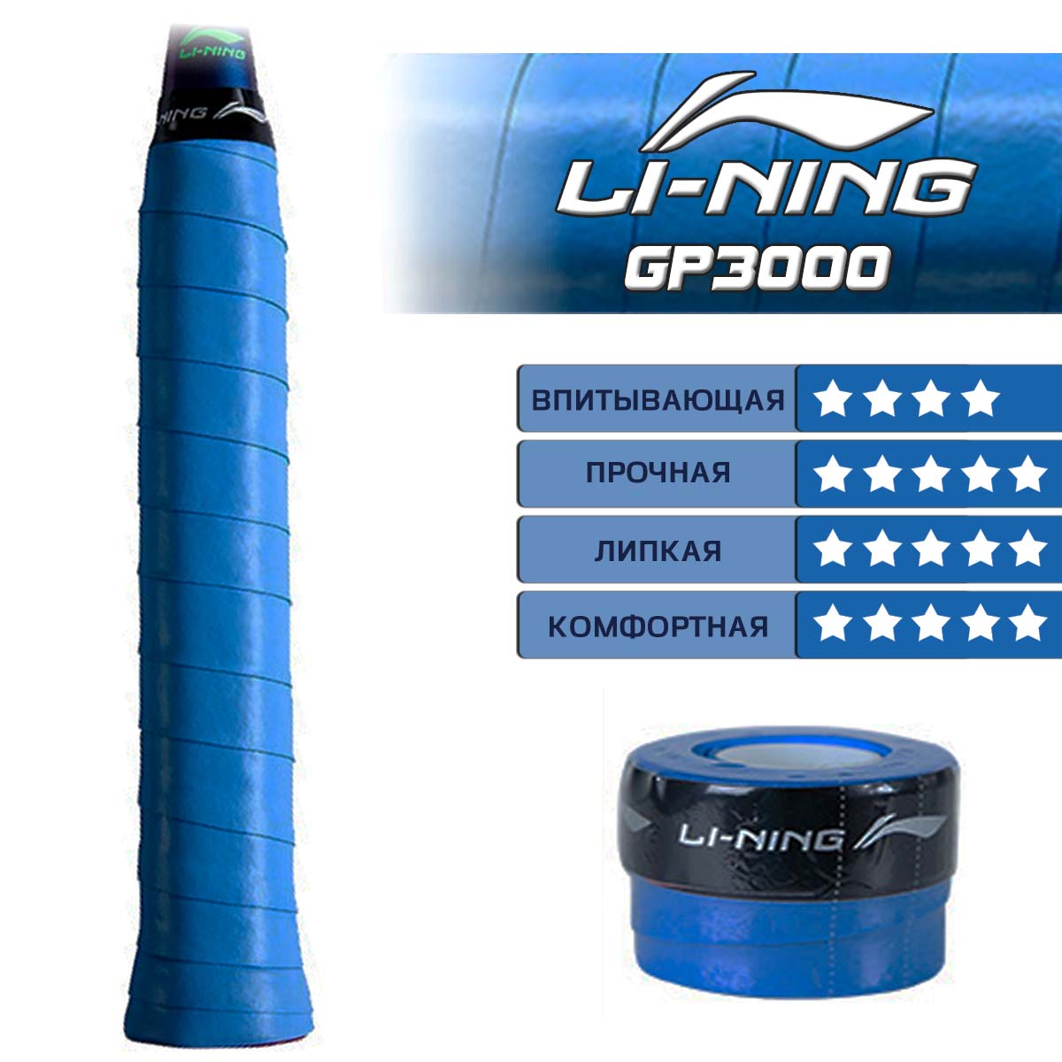 Обмотка LI-NING GP3000 синего цвета представляет собой ленту из мягкого и прочного полиуретана, который обеспечивает хороший захват.
