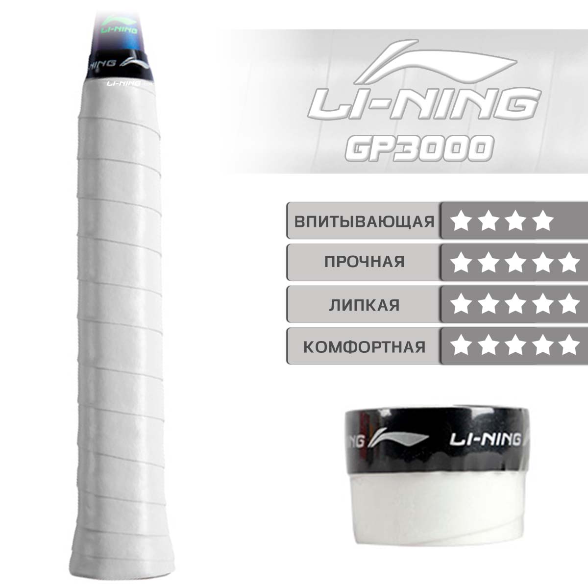 Обмотка LI-NING GP3000 белого цвета представляет собой ленту из мягкого и прочного полиуретана, который обеспечивает хороший захват.