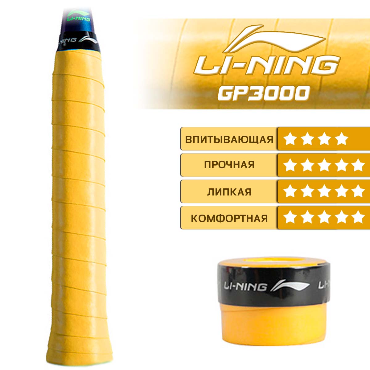 Обмотка LI-NING GP3000 желтого цвета представляет собой ленту из мягкого и прочного полиуретана, который обеспечивает хороший захват.
