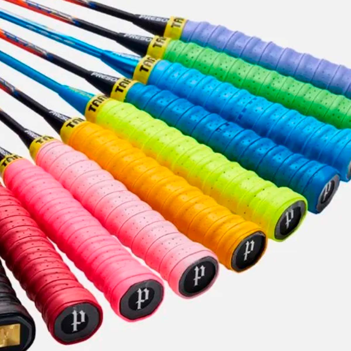 Особенностью обмотки является рельефная полоска из мягкой резины, нанесенная посередине. Эта полоска создает упругий бугорок после круговой намотки на рукоять, что дает ощущение надежного хвата и способствует гашению вибраций после ударов по волану.