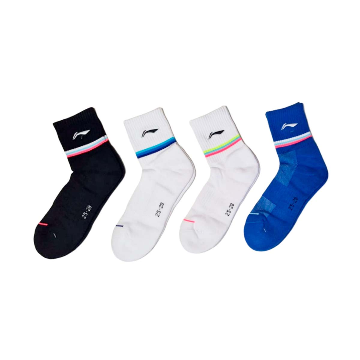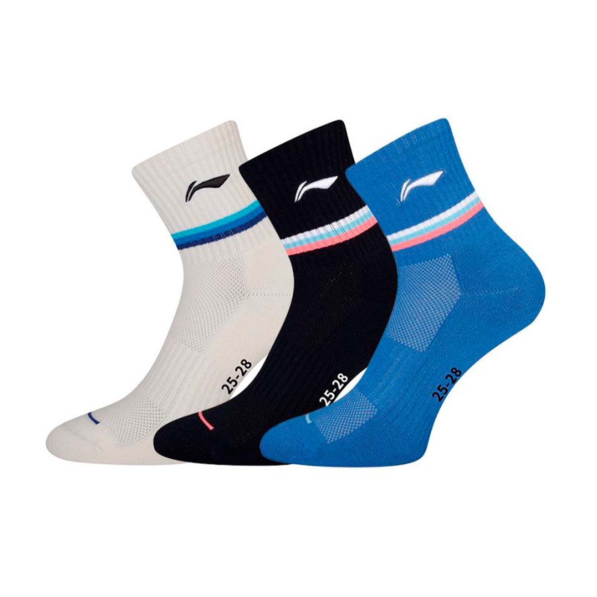 Мужские носки для бадминтона Li-ning черного цвета с голубыми и белыми акцентами сохраняют ноги сухими, отводя пот во время интенсивной игры и обеспечивают дополнительную поддержку и комфорт во время быстрых движений на площадке.