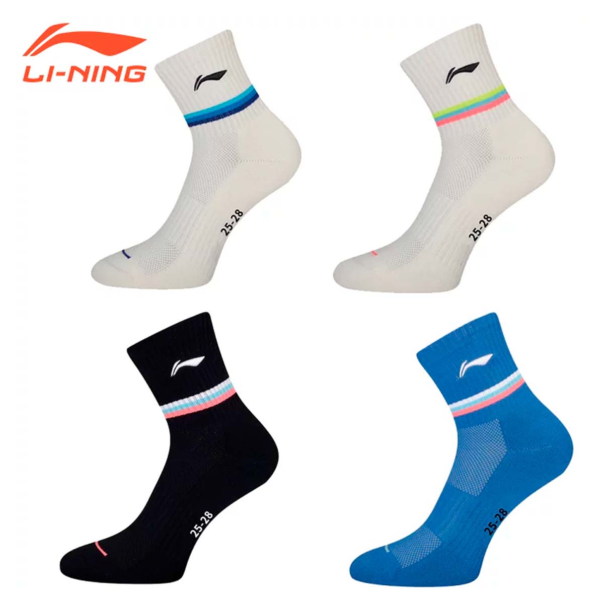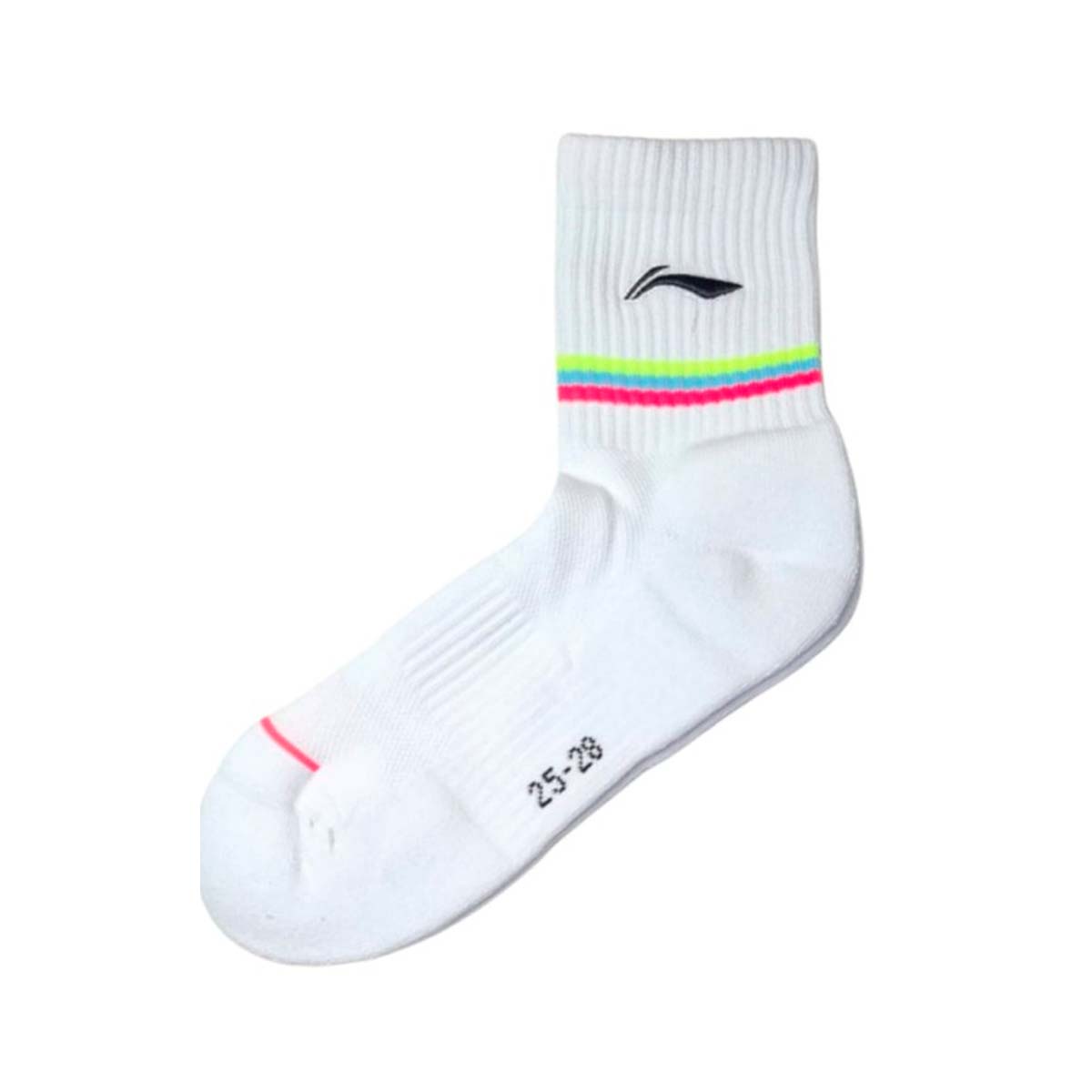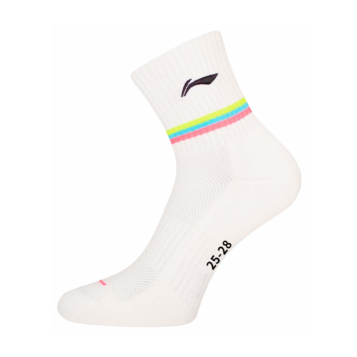 Мужские носки для бадминтона Li-ning белого цвета с розовыми и желтыми акцентами сохраняют ноги сухими, отводя пот во время интенсивной игры и обеспечивают дополнительную поддержку и комфорт во время быстрых движений на площадке.