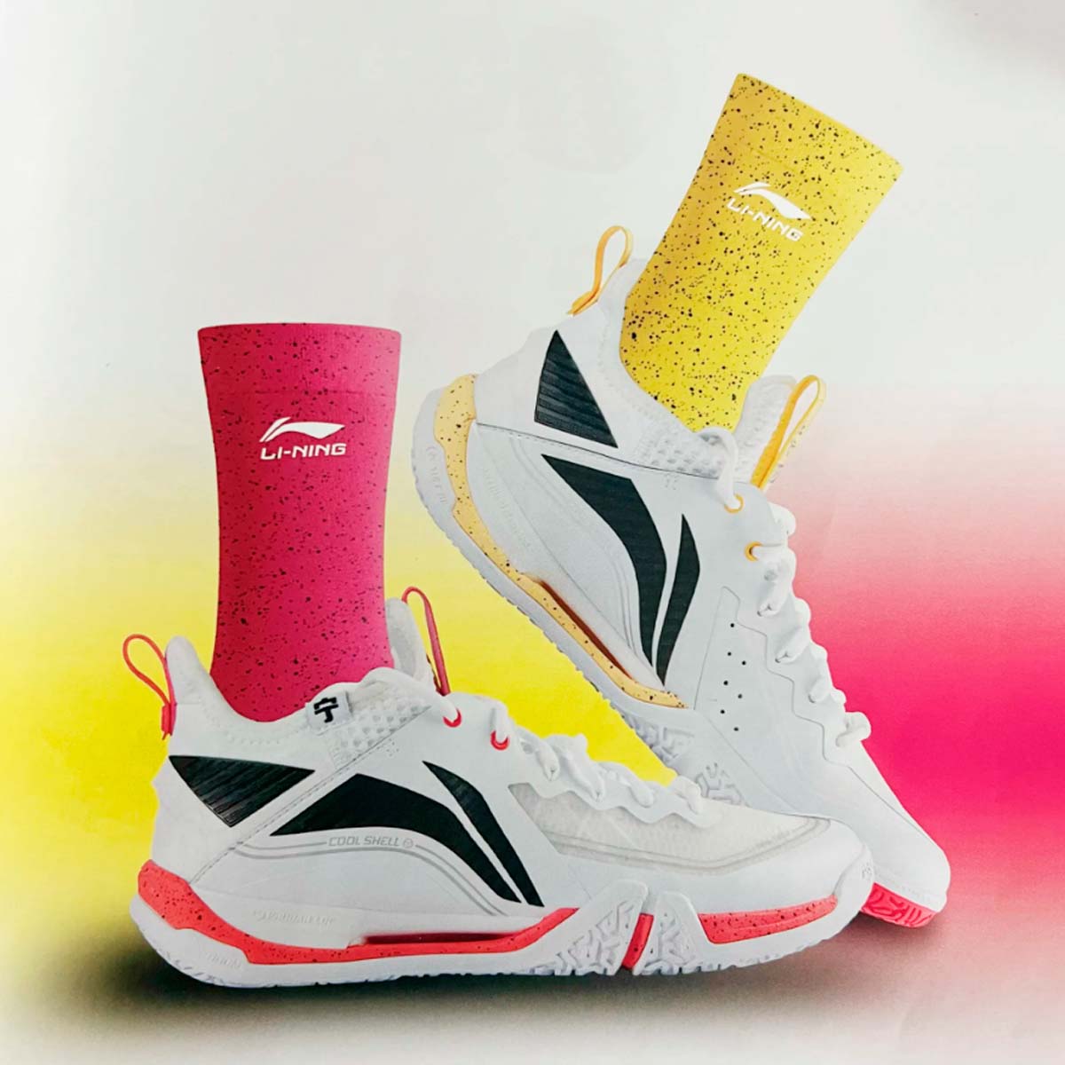 Женские носки для бадминтона Li-Ning оранжевого и розового цвета с черными вставками впитывают влагу и помогают сохранить ноги сухими, отводя пот во время интенсивной игры, а также обеспечивая дополнительную поддержку и комфорт во время быстрых движений на площадке.