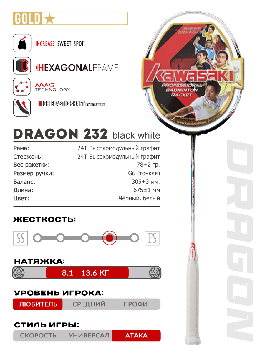 Ракетка для бадминтона KAWASAKI DRAGON 232 BLACK WHITE