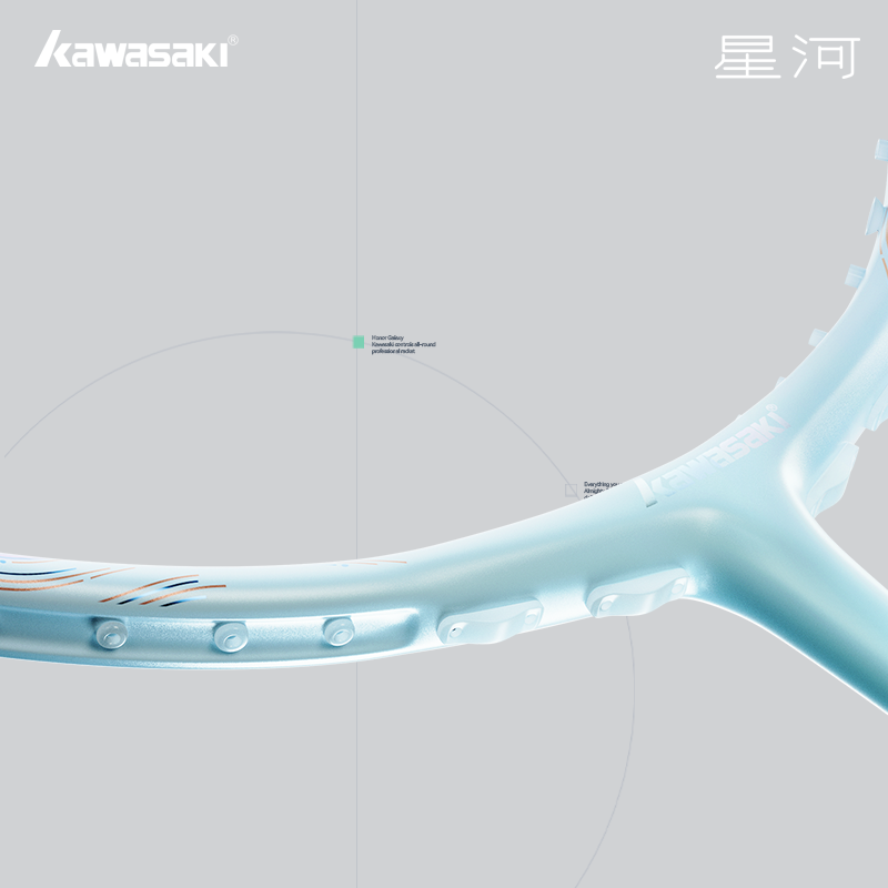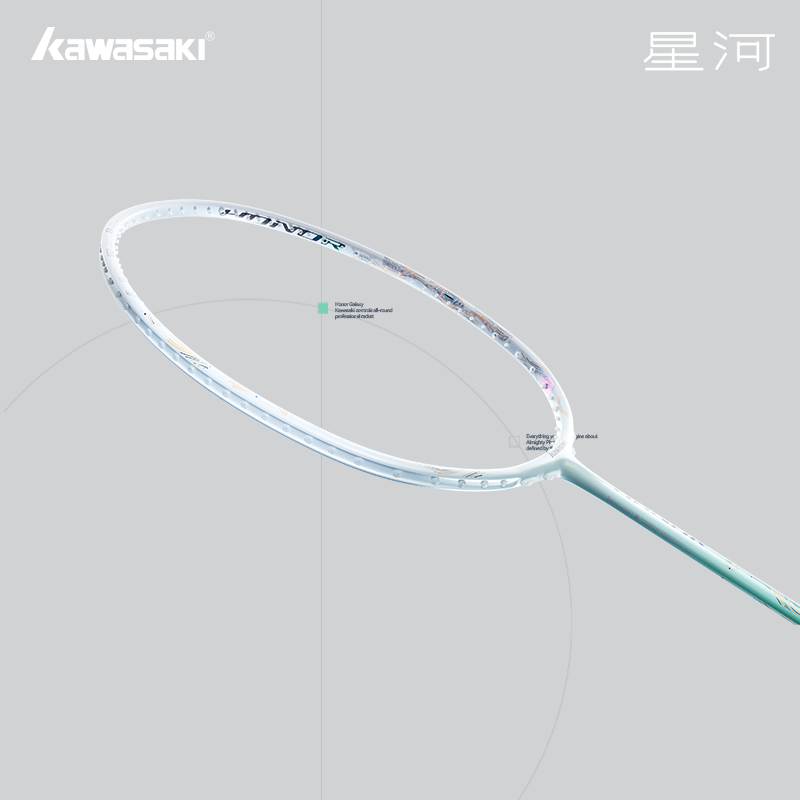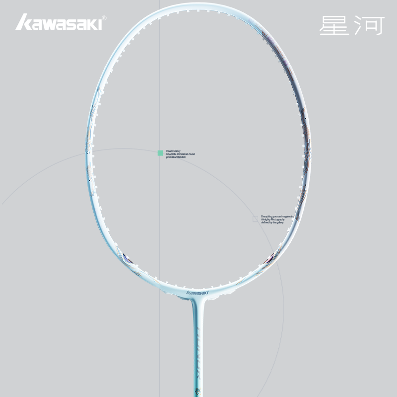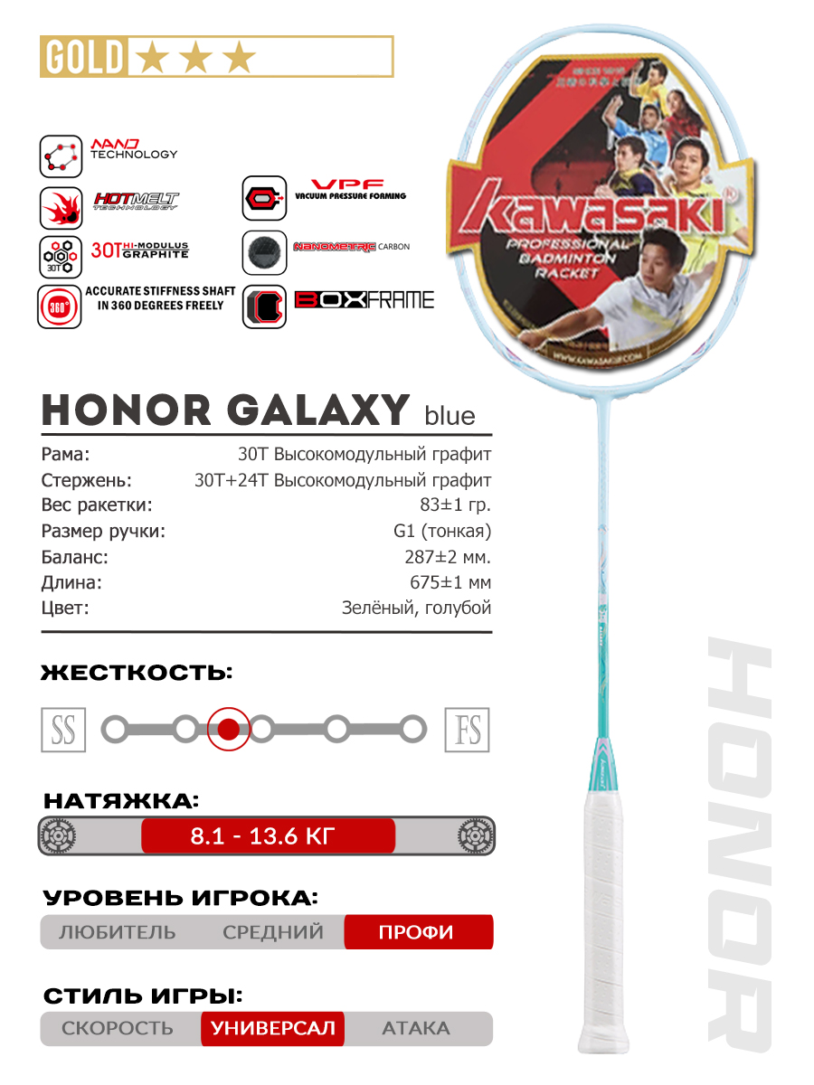 Модель KAWASAKI HONOR GALAXY обладает балансом в ручку плюс она весьма легкая (4U), к ней легко привыкнуть с первой игры. Нет чувства тяжести и напряжения в кисти. Она легко справляется с ударами с любой зоны площадки, но разработана больше с учетом потребностей игроков с наступательным стилем игры.