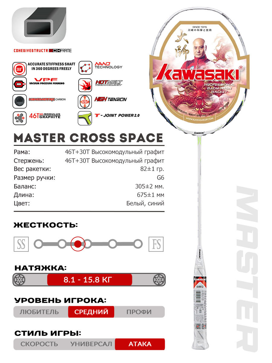 Ракетка, которая выдерживает натяжку струны до 15,8 кг для самой мощной силовой игры — это новая клубная модель KAWASAKI MASTER CROSS из суперсерии от тренера Mao. Предназначена для среднего уровня игроков, которые уже доросли до агрессивных ракеток с сильно тяжелой головой.