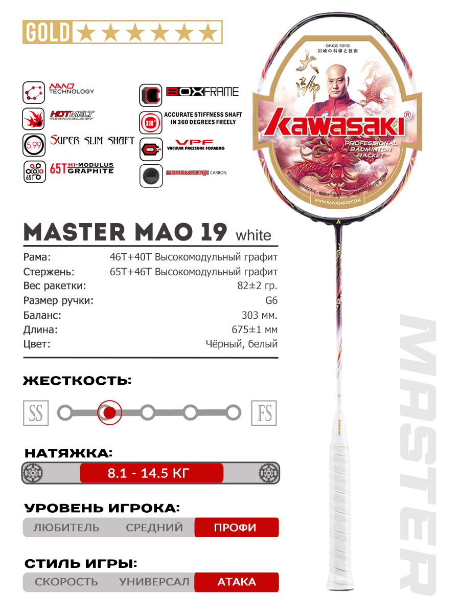 Бренд Kawasaki уже два десятилетия делает ставку на доступные по цене, но технологичные и функционально проработанные ракетки для бадминтона. При изготовлении модели MASTER Mao 19 использовано несколько видов высокомодульного графита разной плотности — 65T, 45T, 40T и технологии их соединения, позволяющие материалу не расслаиваться и не трескаться под нагрузкой, такие как HotMelt и Nano Technology.