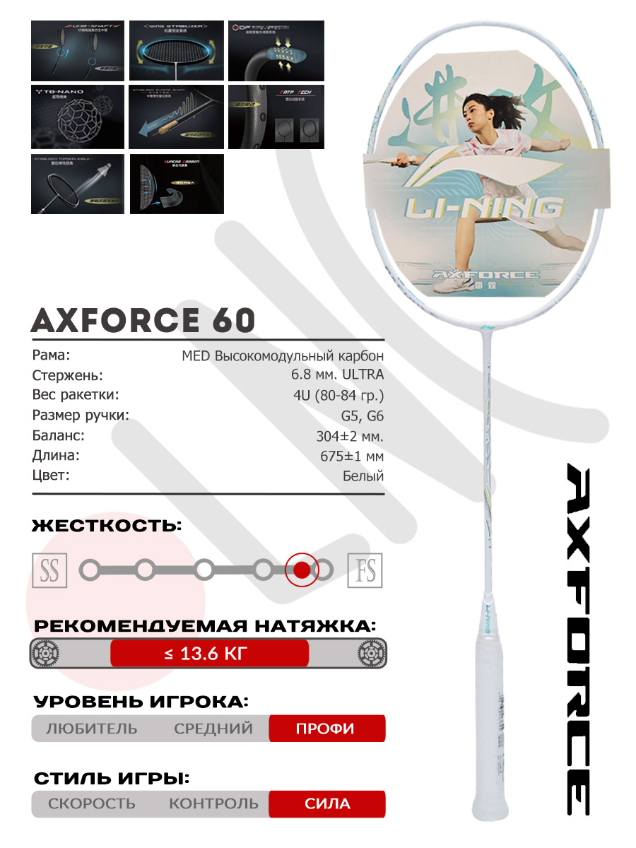Li-Ning AXFORCE 60 — профессиональная модель для игроков среднего и высокого уровня. Ракетка имеет чрезвычайно привлекательный дизайн в белом цвете, из-за чего кажется мягкой и немного «девочковой», но если посмотреть на характеристики, сразу становится понятно, что это оружие, скорее похожее на боевой лук. Ракетка относится к категории Tectonic — особой серии силовых мощных ракеток.