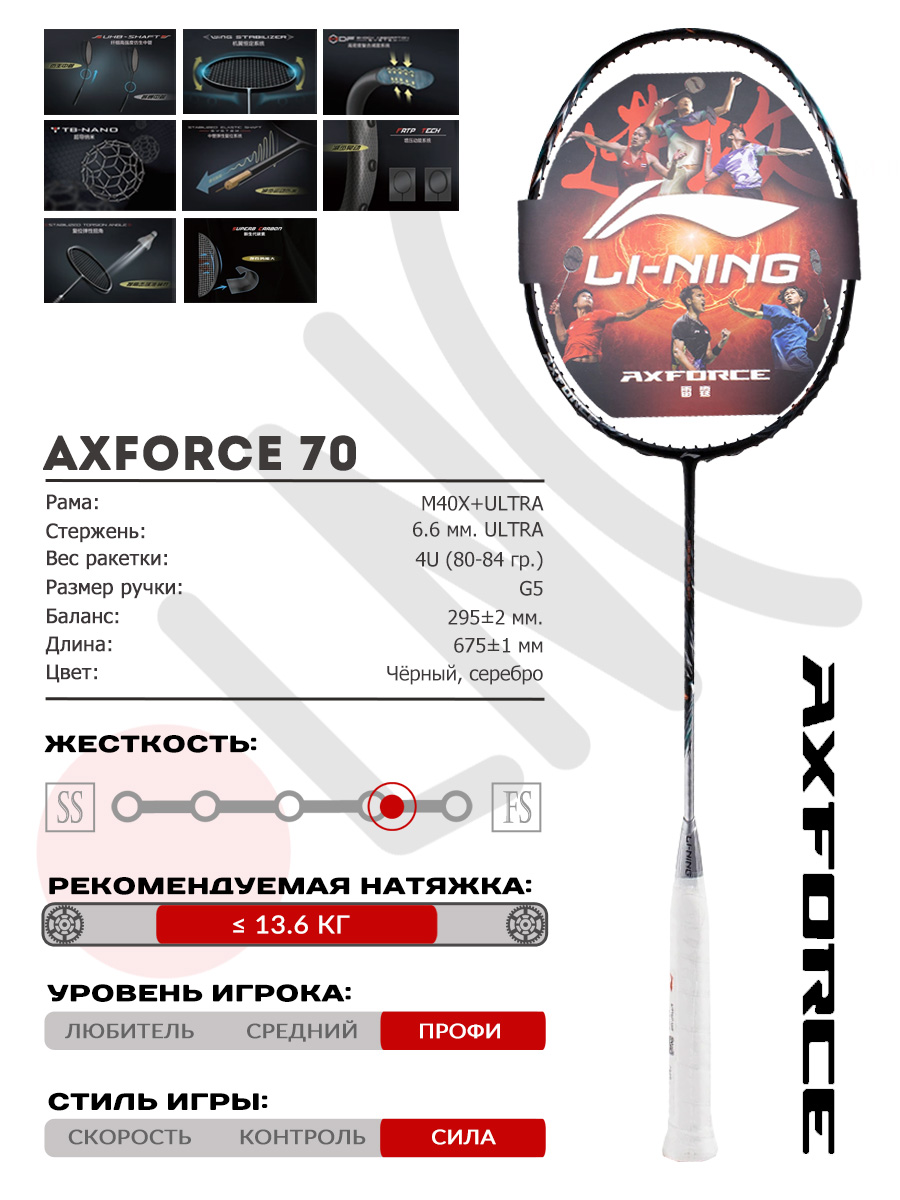 Axforce 70 — это гибкая и скоростная ракетка в двух облегченных категориях веса 4U и 5U. Сочетание гибкого стержня, баланса в ручку и легкого веса дает возможность игроку чувствовать, насколько ракетка отзывчива, и какие технически точные удары ею получаются.