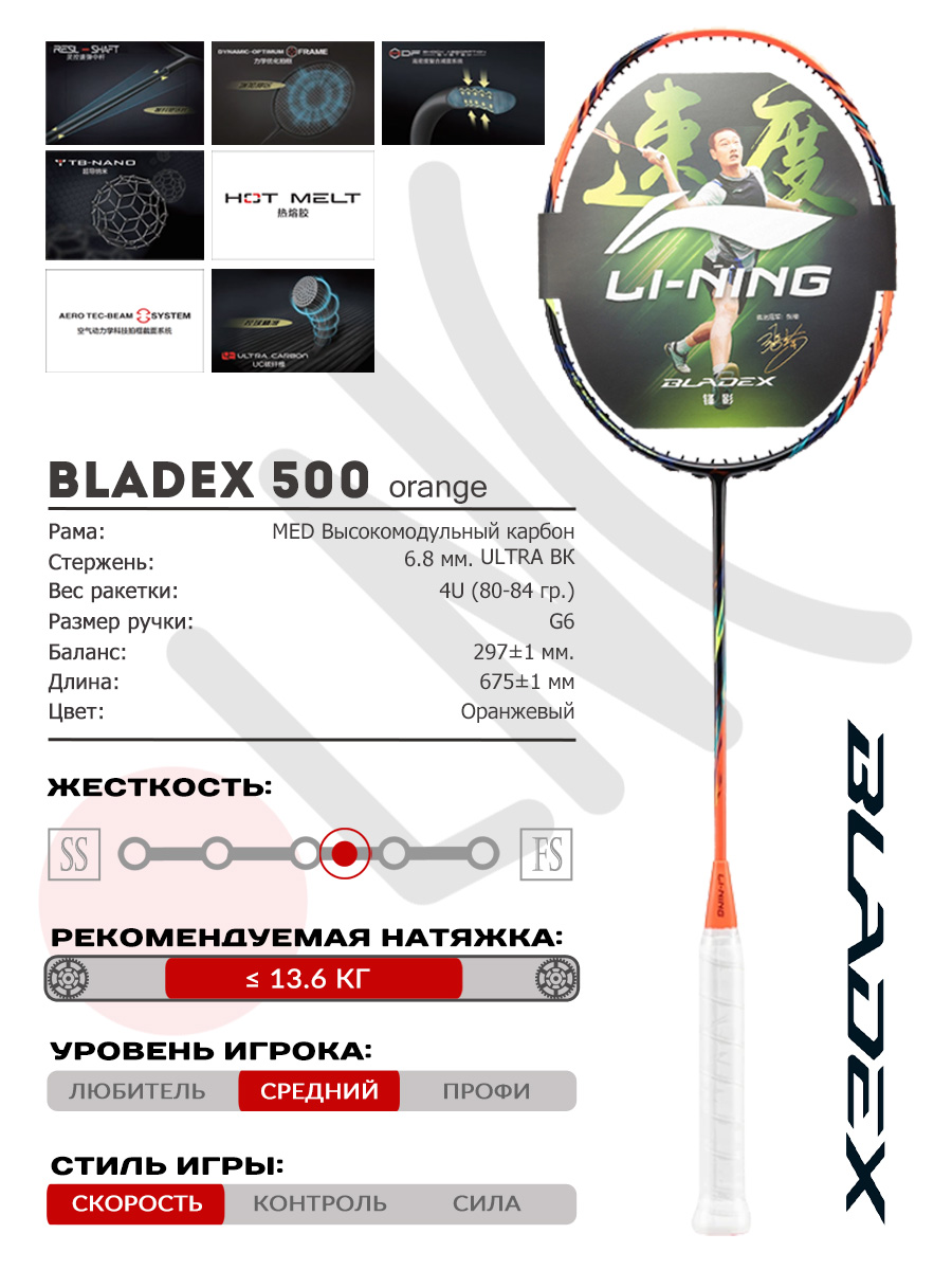 Бадминтонная ракетка, которая вызывает истинные эмоции! Li-Ning BladeX 500 — это союзник, который хочет крушить соперника на корте не меньше вашего.