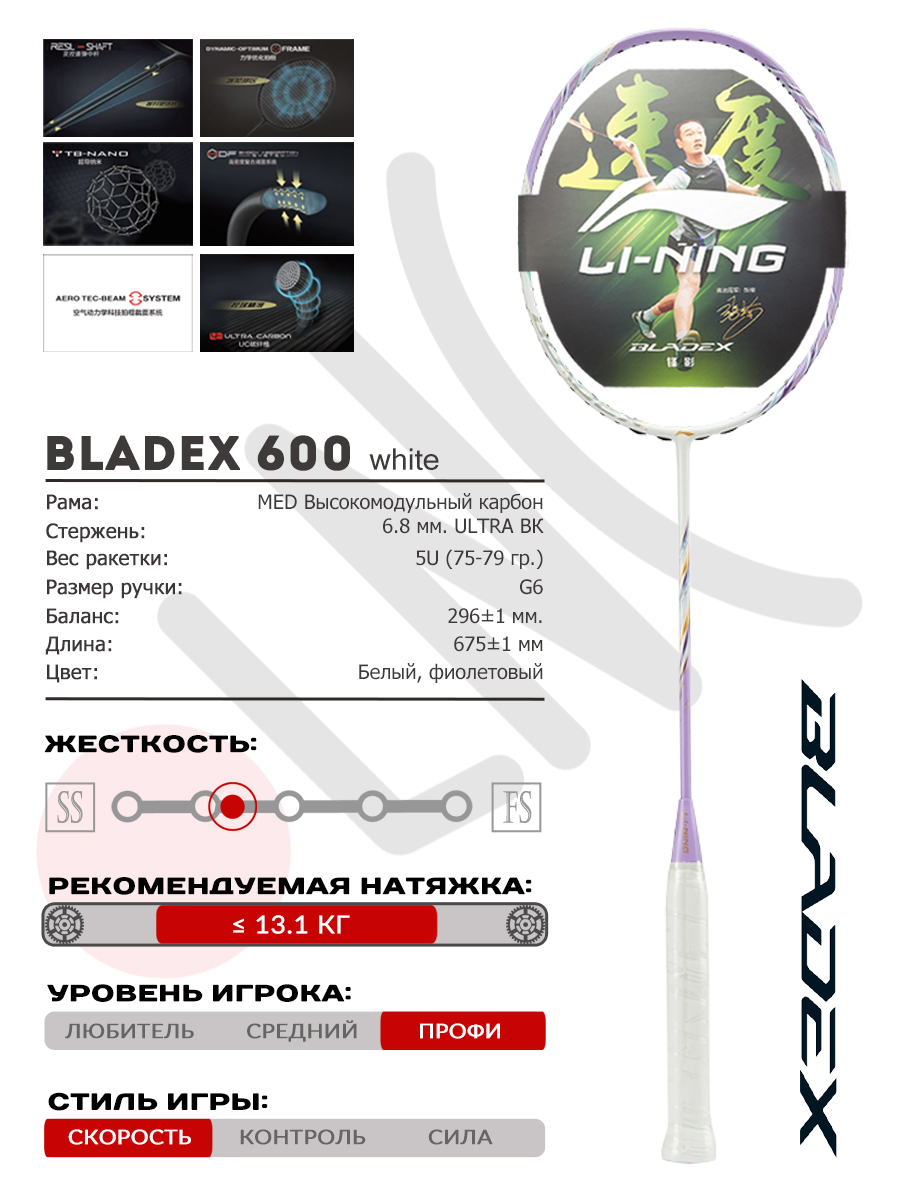 LI-NING Bladex 600 NEW относится к профессиональному классу ракеток, которые надолго задерживаются в руках своих обладателей благодаря грамотной сбалансированности и универсальности.