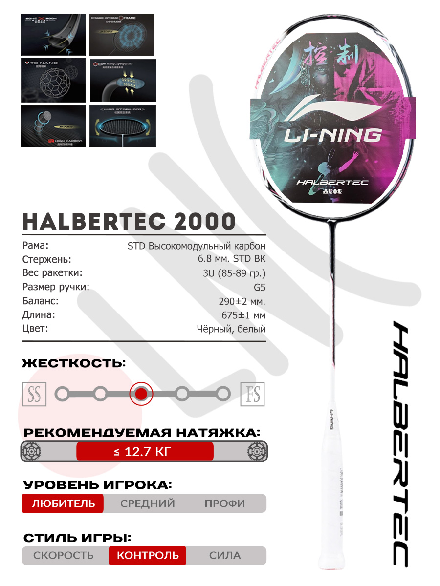 Halbertec 2000 — доступная ракетка для бадминтона из новейшей серии Li-Ning Halbertec. Очень маневренная и простая модель, изготовленная из высокоэластичного углеродного волокна STD. Минималичная бело-черная цветовая гамма в сочетании с яркими надписями и асимметричным дизайном делают ракетку нескучной.