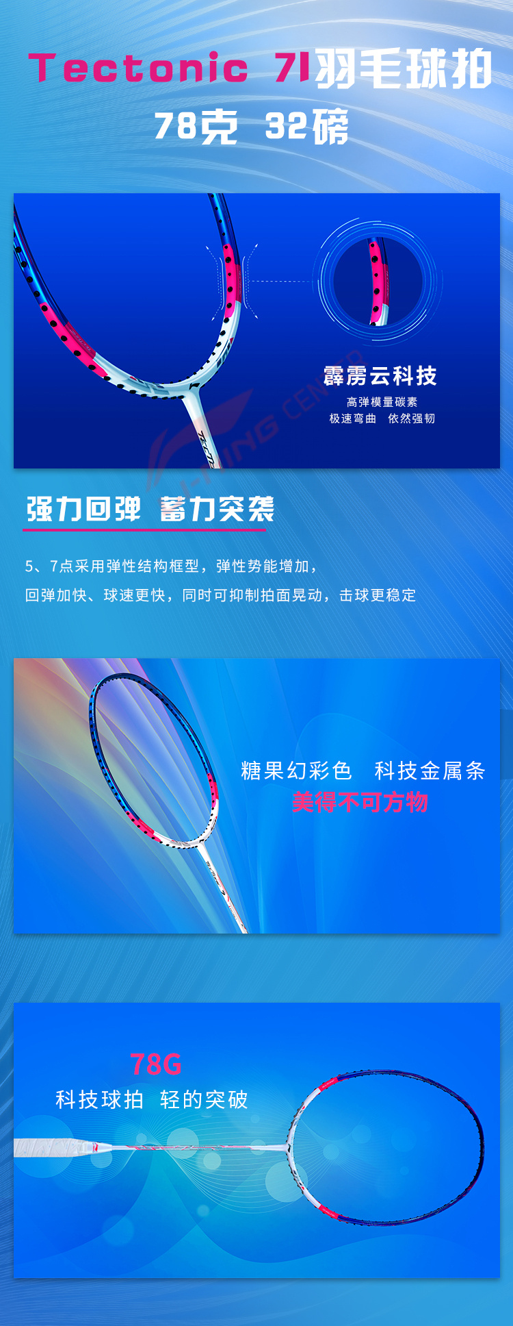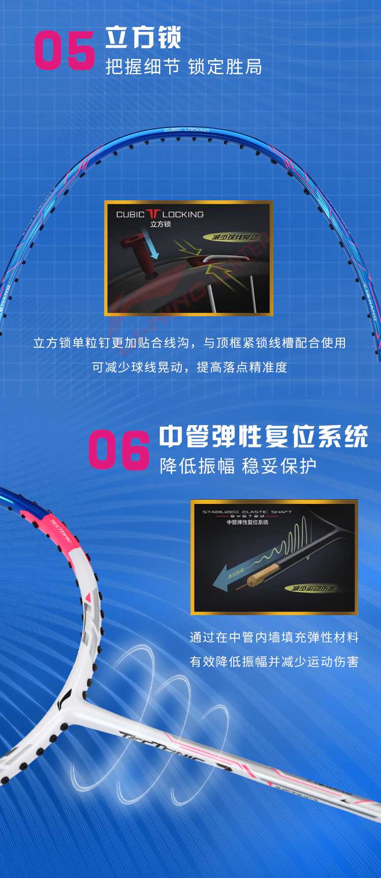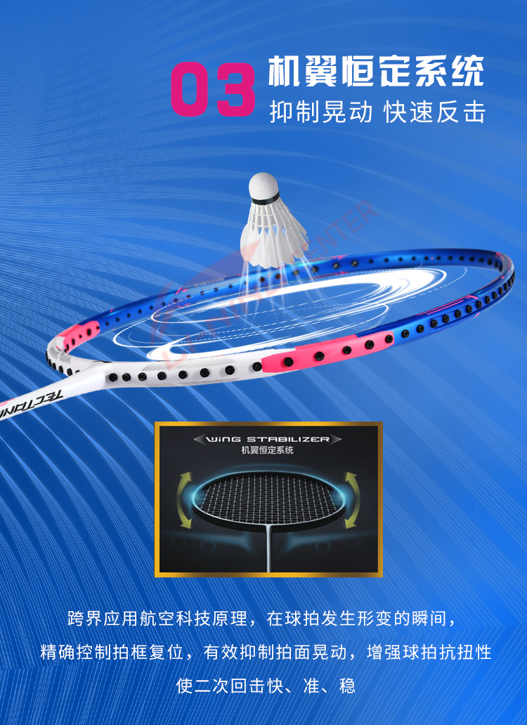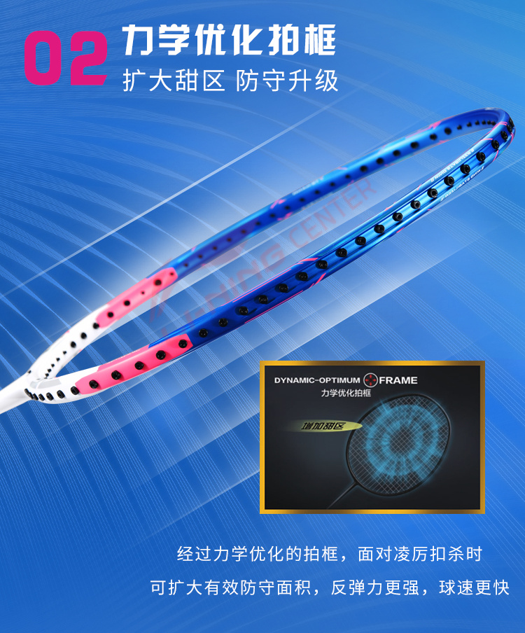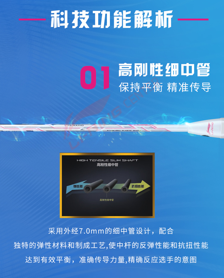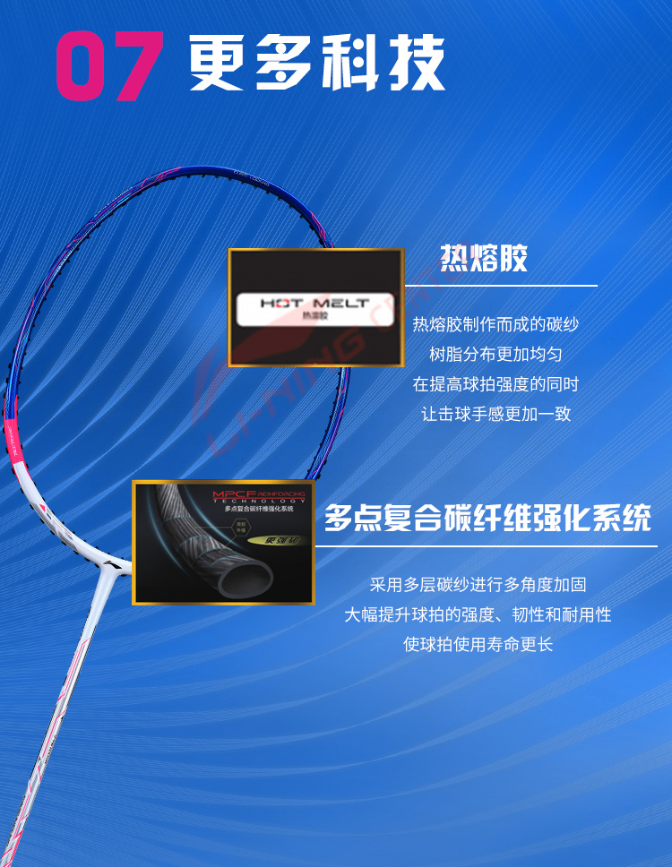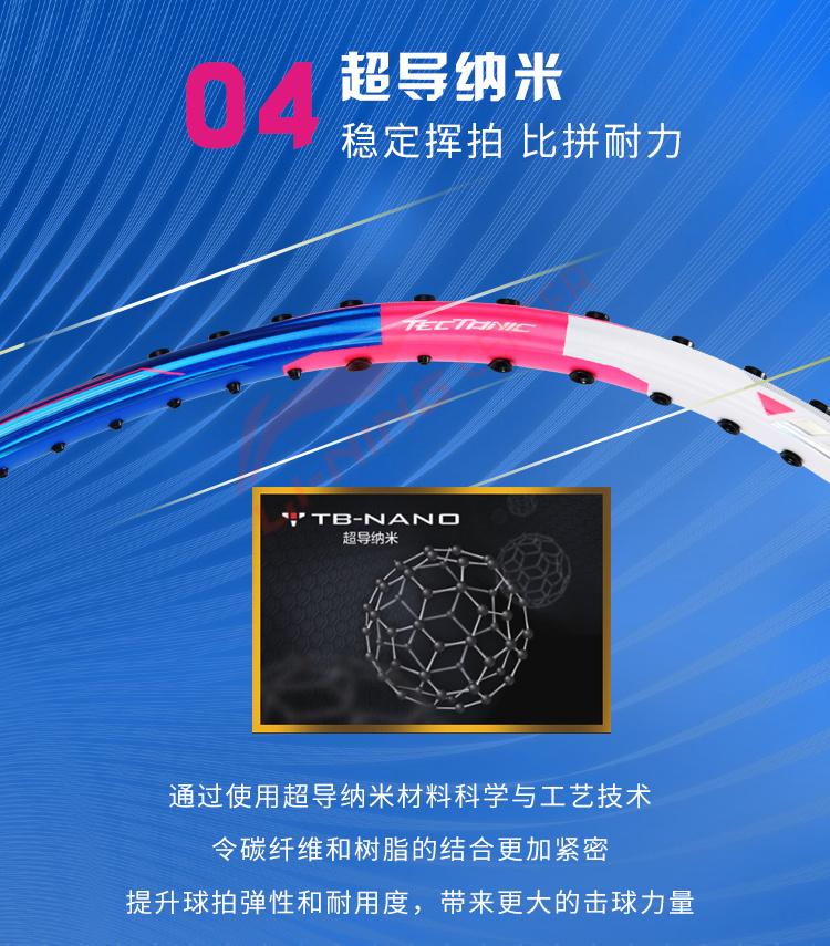 Использование нанометрических технологий многократно увеличивает качество и силу удара, повышая функциональный лимит прочности ракетки. Углеродное волокно TB NANO, разработанное компанией LI-NING, делает ракетку чрезвычайно прочной и гибкой при малом весе. Ударная сила ракетки повышается на 20%