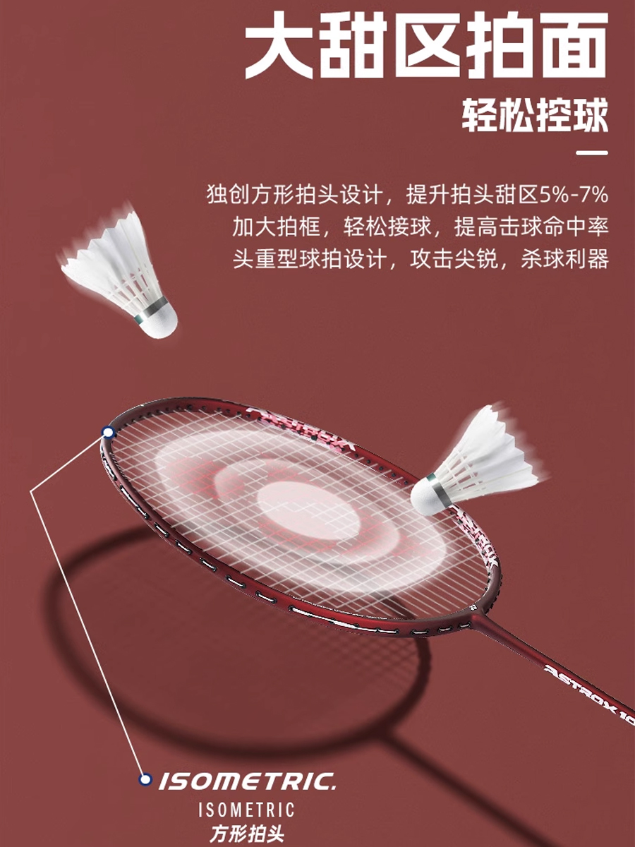 Yonex Astrox 10 сделана на классической базе Isometric c расширенным игровым пятном. За то, что благодаря этой особенности, количество точных ударов повышается, изометрические ободы любят и новички, и мастера.