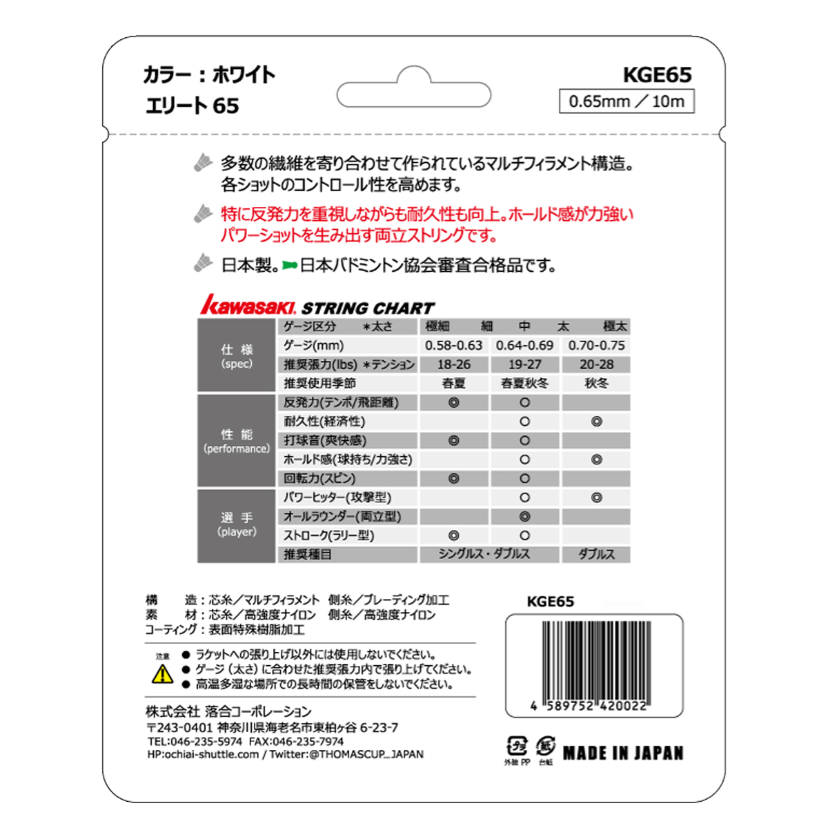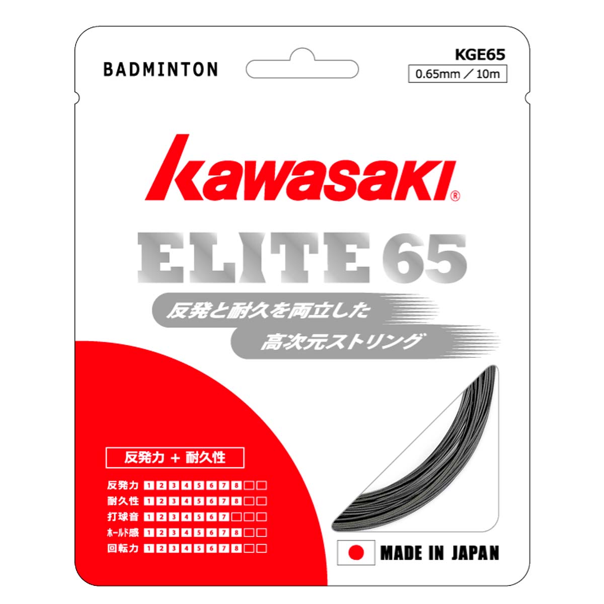 Струна Kawasaki Elite 65 черного цвета имеет ряд характеристик, которые делают ее идеальной для игроков, которые хотят получить одновременно хороший контроль волана, звук при ударе, ударопоглощение, мощность и ее долговечность.