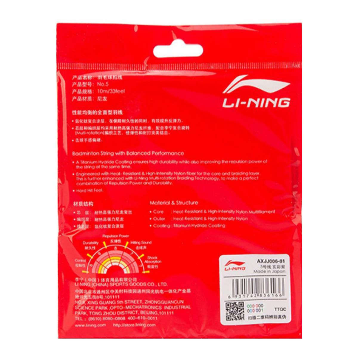 Струна для бадминтона LI-NING №5 в нежном фиолетовом цвете — широко используется ведущими международными игроками. Несмотря на то, что в профессиональном спорте превалирует выбор тонких струн, многие игроки считают, что хоть тонкие струны и хороши по звуку, но они не могут обеспечить достаточную мощность удара. Поэтому бадминтонисты высокого уровня нередко выбирают более толстые струны. Например, Фу Хай Фэн — игрок №1 в парном разряде — играет ракеткой со струной LI-NING №5, толщина которой составляет 0,69 мм.