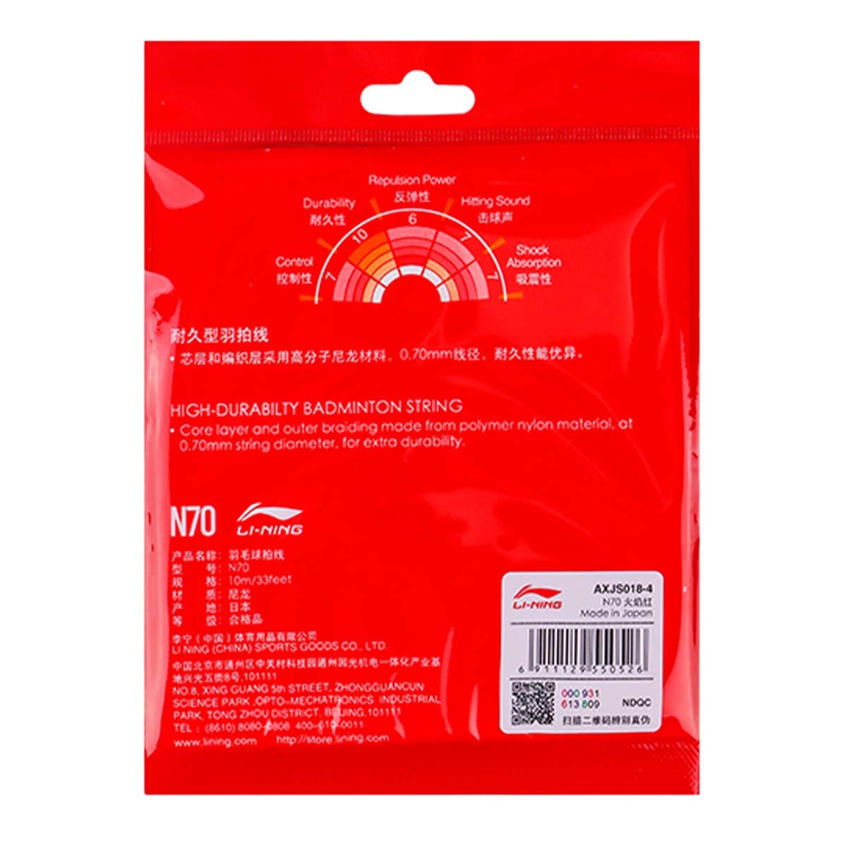 Бадминтонная струна Li-Ning N70 красного цвета - хорошо сбалансированная струна высокой прочности.