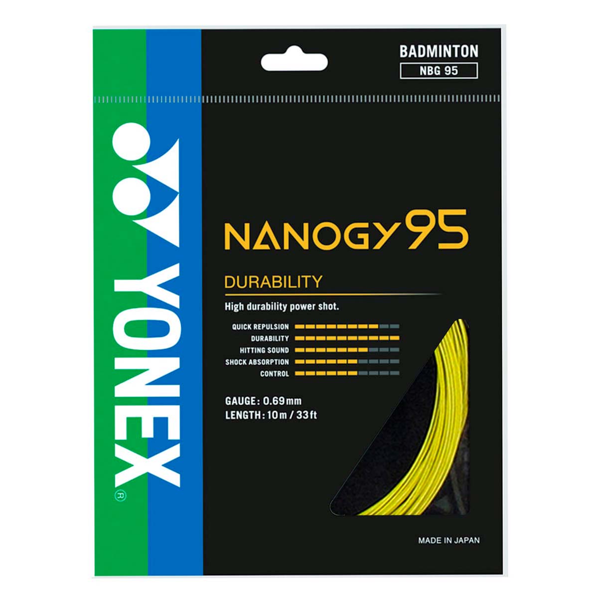 Бадминтонная струна Nanogy95 от Yonex ярко-желтого цвета - это оптимальный баланс между прочностью и отличными игровыми характеристиками.