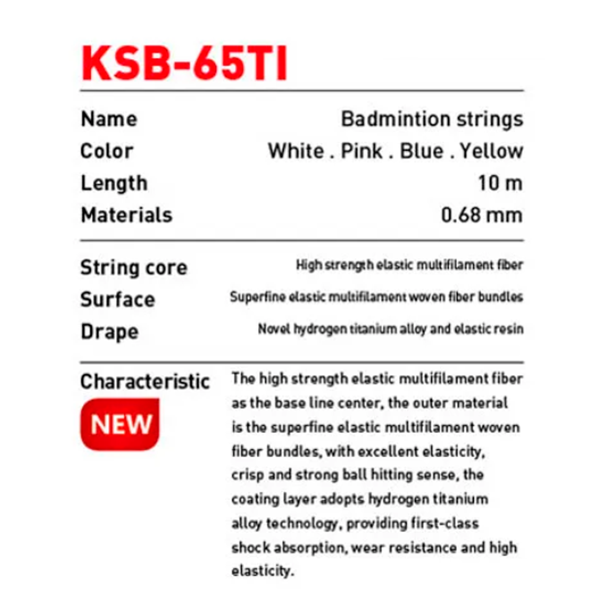 Струна для бадминтона Kawasaki KSB-65Ti представляет собой мультифиламент, изготовленный из высокопрочного нейлона.