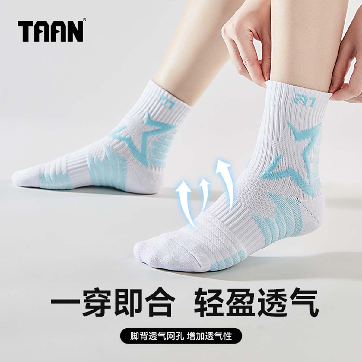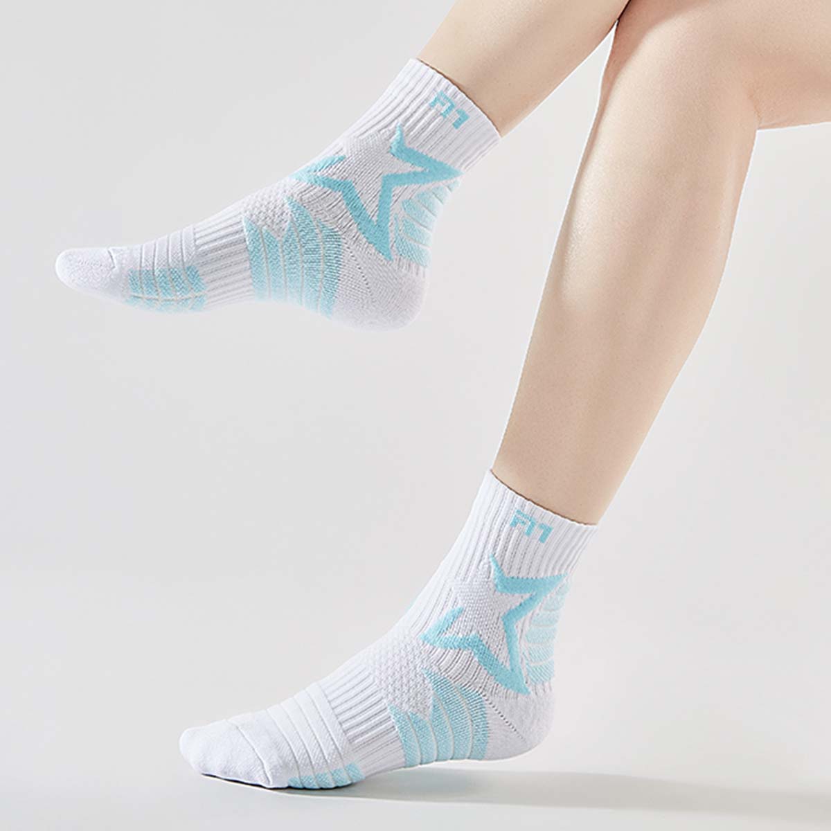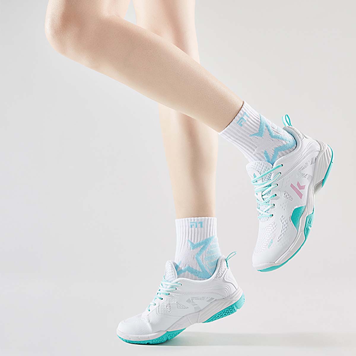 Профессиональная модель белого цвета с голубыми акцентами для бадминтона, фитнеса, бега и интенсивных тренировок. Носки сочетают в себе высокую износостойкость и комфорт благодаря зональному конструированию вязаного полотна.